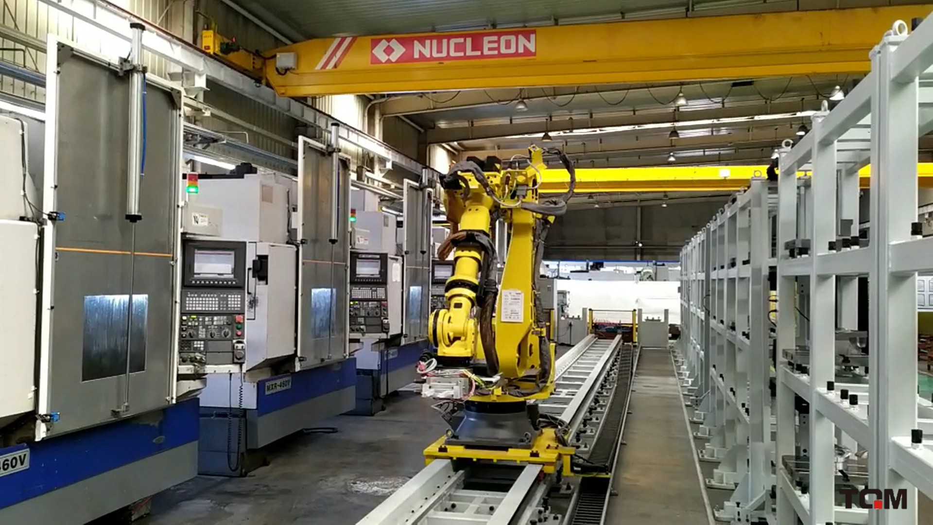 智能生產(chǎn)線,利用車間內(nèi)匹配的設(shè)備進(jìn)行智能化升級(jí)改造,加入機(jī)械臂的應(yīng)用,使線體內(nèi)機(jī)床自動(dòng)運(yùn)轉(zhuǎn)及調(diào)度,達(dá)到非標(biāo)件柔性自動(dòng)調(diào)度生產(chǎn)的效果。